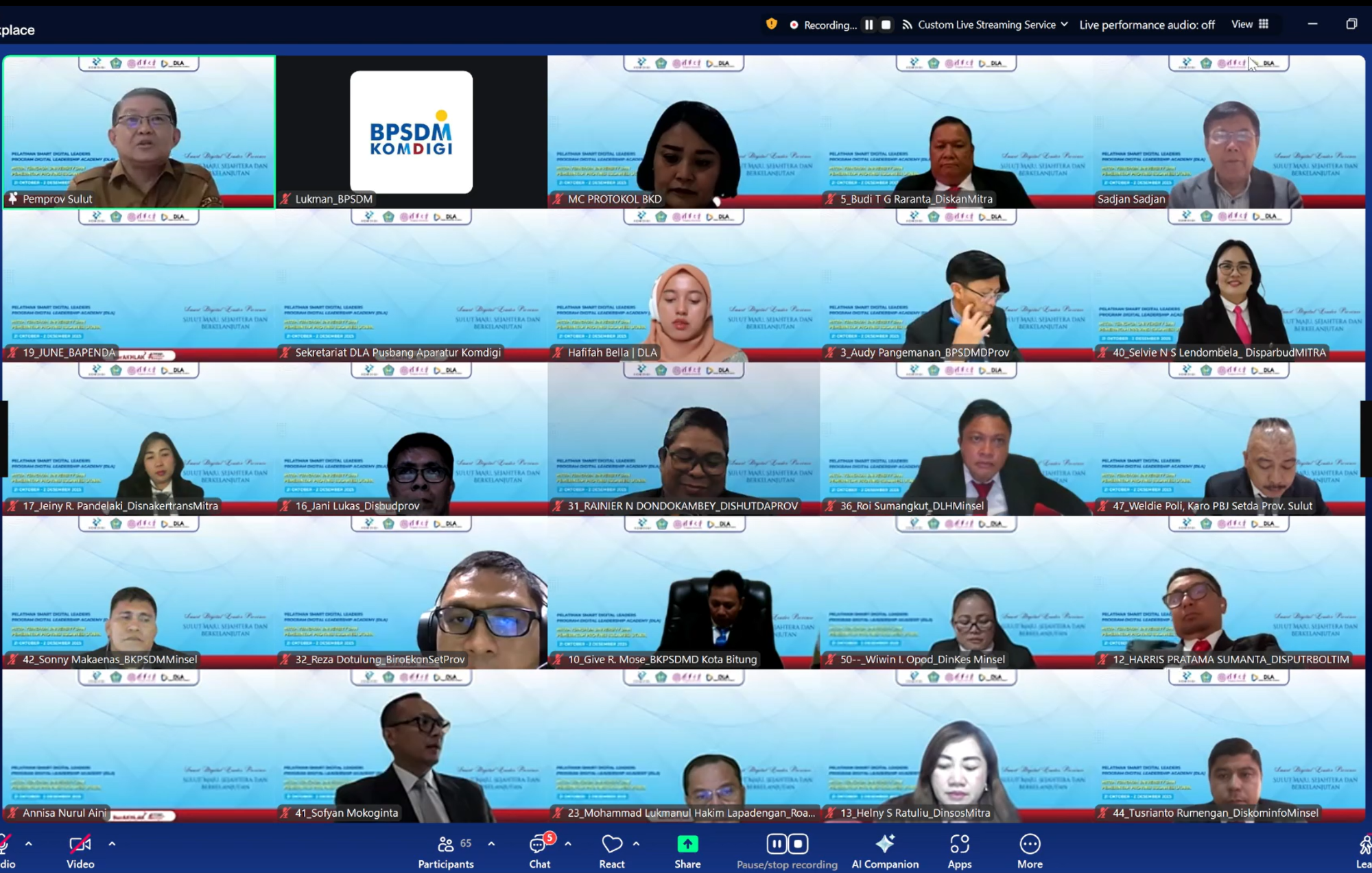 Sebanyak 50 peserta mengikuti kegiatan ini, terdiri dari Kepala OPD dan Pejabat Pimpinan Tinggi Pratama dari pemerintah provinsi serta kabupaten/kota di Sulawesi Utara.