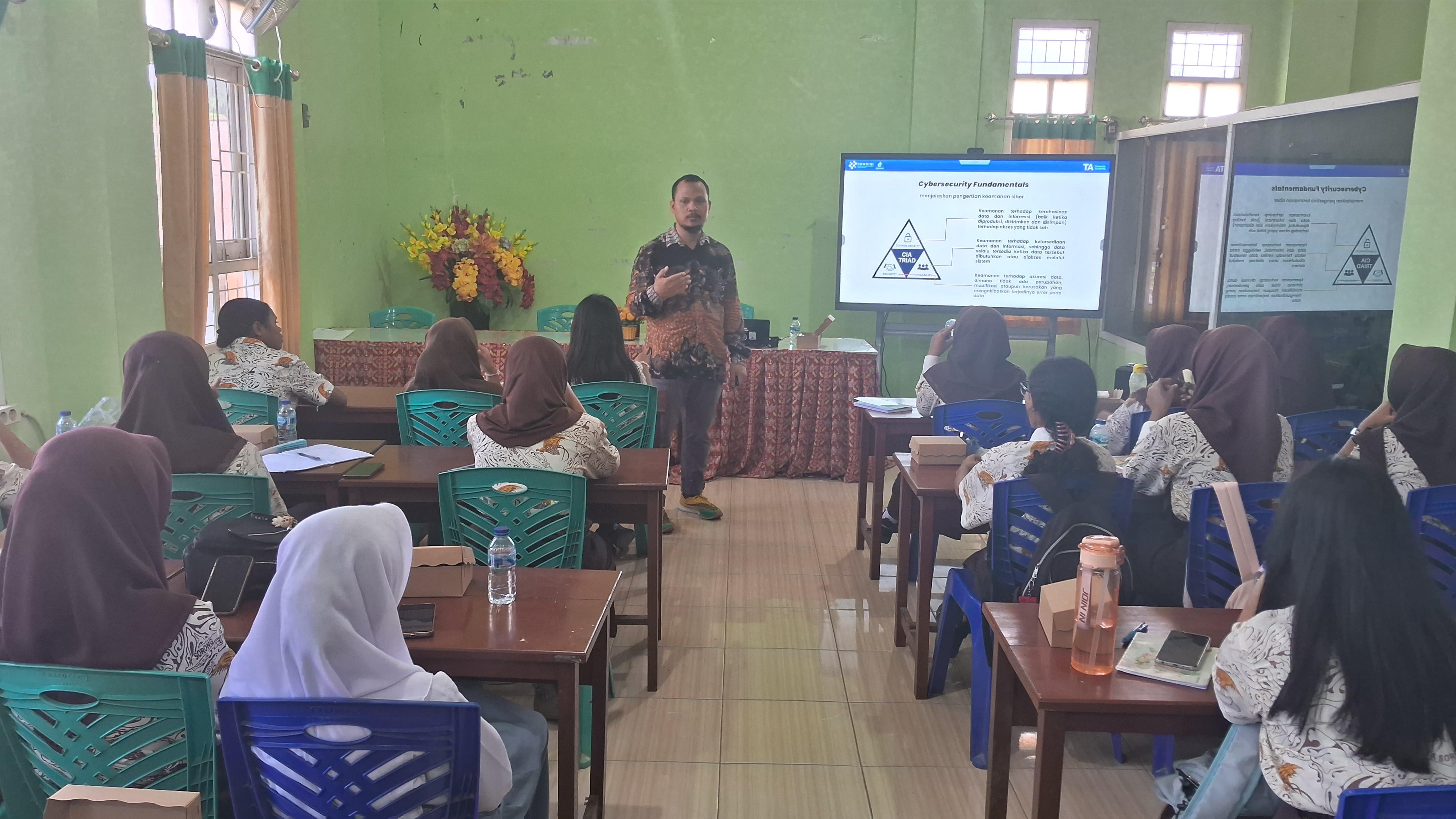 Sementara itu, Thematic Academy Basic Cyber Security difokuskan pada peningkatan literasi keamanan digital pelajar SMA. Materi pelatihan mencakup pengenalan ancaman siber seperti phishing dan pencurian data pribadi, praktik aman di media sosial, serta cara menjaga privasi dan membuat kata sandi yang kuat. Melalui kegiatan ini, siswa diharapkan lebih bijak dan aman dalam beraktivitas di ruang digital.
