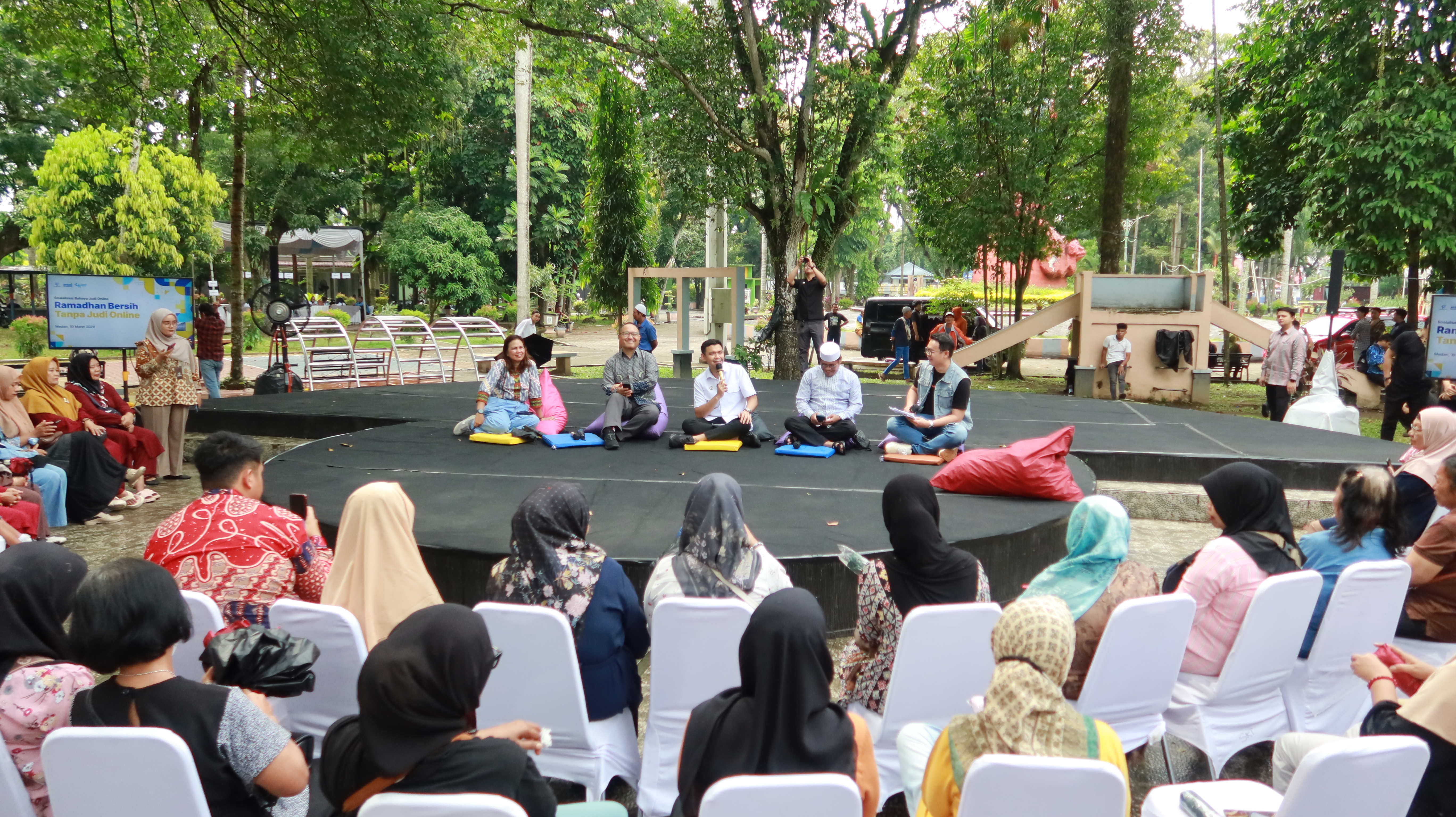 Kegiatan juga diperkaya dengan sesi dialog, tanya jawab, serta tausiyah keagamaan yang mengaitkan bahaya judi online dengan nilai-nilai spiritual. Sejumlah peserta turut menyampaikan testimoni langsung tentang dampak judi online yang mereka alami, termasuk hilangnya akses terhadap bantuan sosial seperti PKH dan BPJS akibat NIK yang terdeteksi terkait aktivitas judi online.